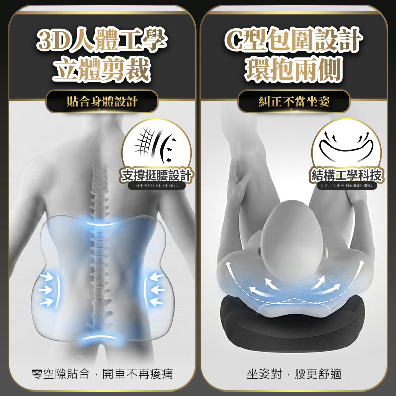 2.C型環抱設計: 兩側包圍支撐,糾正不當坐姿,避免腰部懸空