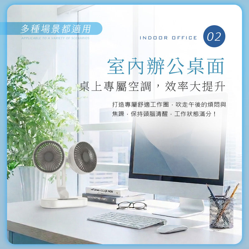 2. 270° 靈活摺疊出風:支架可 90° 調整,風扇頭可 270° 旋轉,不論是直立送風、對角循環還是摺疊收納,完全不受限。