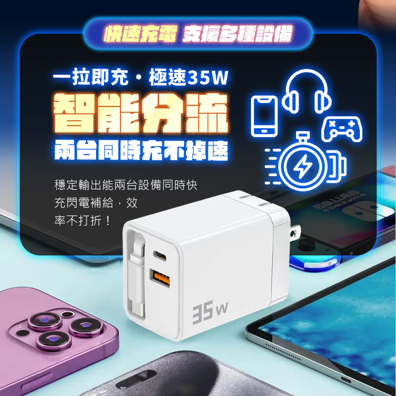 【UTA鴻嘉源】頂級 35W 伸縮線快充頭IC-15【國家驗證 安全合格】磁吸歸位 折疊插腳|PD QC 快充|多孔充電器 Type-C 豆腐頭