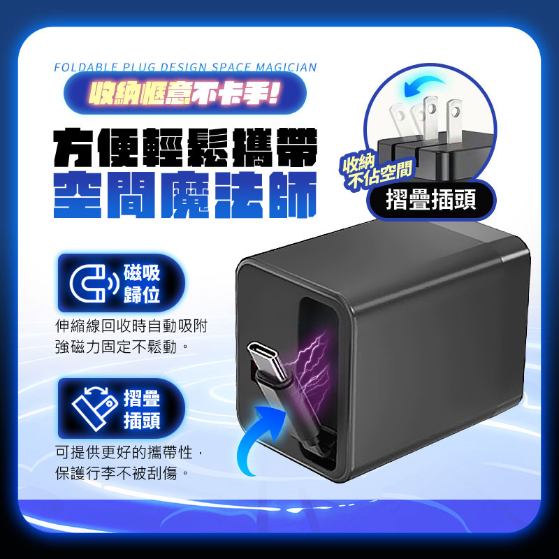 【收納設計】:採用 折疊式插腳,加上 磁吸歸位 設計,收納方便不佔空間,出門旅行一顆搞定所有設備。