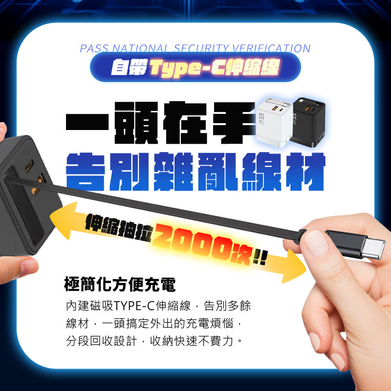 【內建伸縮線】:告別雜亂線材,拉出即可使用,內建線經 2000次 伸縮測試,堅固耐用。